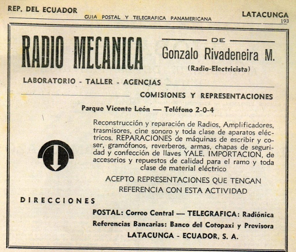 En la GUIA POSTAL Y TELEGRÁFICA PANEMERICANA de 1947, editada en Buenos Aires, aparece la información de Ecuador, donde en las páginas 188 a 193 podemos leer la información de la ciudad de Latacunga, allí tenemos la publicidad de RADIO MECANICA de Gonzalo Rivadeneira M. que ilustra esta narración, de tal manera que podemos leer con detalle lo que ofrecen sus servicios profesionales. Ya para el 2 de noviembre de 1946 aparece una publicidad en “El Heraldo” acerca de la misma Radio Mecánica del Sr. Rivadeneira, ofreciendo en venta además juguetes para navidad.