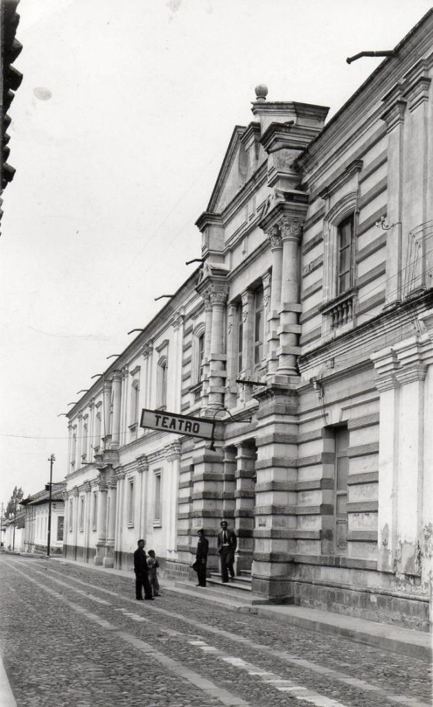 En agosto de 1929 se inauguró, con la presencia del Presidente Isidro Ayora, el teatro del colegio, obra del Arq. Augusto Ridder Ostman, en estilo neoclásico con hermoso telón pintado por el artista Pedro León Donoso, butacas y palcos de gran belleza, paneles decorados y pintados por el artista latacungueño Francisco Aymacaña. Hacia 1958, autoridades “enemigas de la ciudad” destruyeron el teatro (palcos y demás). El patrimonio edificado el plantel, así como buena parte de sus bienes, han sufrido de adulteraciones y desapariciones respectivamente.